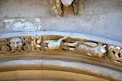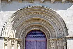 Par contre, au sommet de la voussure sont représentés des personnages de facture romane. Les voussures sont recouvertes d'un décor végétal, frises de palmettes ou d'acanthes sèches. La clef de l'archivolte porte un diable en effigie, un masque à oreilles en pointes qui recrache des tiges volutées. Il est probable que ce masque, qui est de style Renaissance, a été ajouté lors d'une restauration du XIXe siècle.