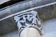 Toutes les sculptures[3] du chevet se trouvent sous la corniche : une vingtaine de modillons et quatre corbeilles sans tailloir.