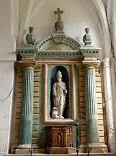 - Le retable de sainte Anne, au chevet de la chapelle du nord, paraît comme une version simplifiée de ce précédent retable. Les bossages font défaut, l'entablement est réduit à la corniche, les denticules manquent, et les pots-à-feu sont angulaires.