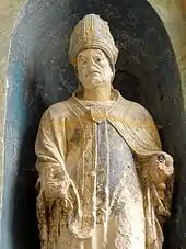- La statue en pierre représentant un saint non identifié, à droite du retable de la chapelle latérale nord, mesure environ un mètre de hauteur, et date de la fin du XVIe siècle. Elle est très mutilée, et a perdu sa polychromie. Selon l'inscription délavée sur son socle, elle représente saint Sébastien, mais ne concorde pas du tout avec l'iconographie habituelle. Par ailleurs, lors de leurs visites pastorales, les archevêques Jacques Nicolas Colbert (1691-1707) et Claude-Maur d'Aubigné (1708-1719) épinglent régulièrement les statues de saint Sébastien pour leur nudité et indécence, et elles sont donc retirées ou repeintes. Probablement, la statue actuelle a été montée sur le socle d'une statue de saint Sébastien disparue. La partie postérieure de la tête manque, et il n'est même pas certain s'il s'agit d'un homme ou d'une femme ; cependant, de courts tenons en métal sur le pourtour de la tête paraissent avoir servi de fixations à une couronne maintenant disparue. Il n'y a plus d'attribut, mais selon la position des doigts, il paraît possible que la main gauche tenait initialement une palme[25]. Selon Jacques Sirat, il pourrait s'agir de saint Louis[26] (qui n'est toutefois par un martyr).