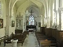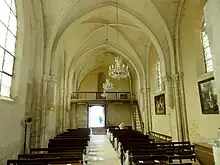 À l'intérieur, la nef apparaît comme une construction de la fin du XIIe siècle, dont seules les ouvertures ont été modifiées. Grâce à l'absence de bas-côtés et la surface vitrée importante, l'espace est lumineux, et en complément, les lustres en cristal assurent un éclairage harmonieux, que ne sauraient apporter les projecteurs installés aujourd'hui dans la plupart des églises. Le volume est encore caractéristique des nefs non voûtées de la période romane, avec une largeur un peu plus importante que dans les premières nefs voûtées d'ogives de la région, mais une hauteur sous le sommet des voûtes modeste, dépassant de peu la largeur. L'on note que le chœur n'est pas bâti dans l'axe de la nef : la pile à droite de l'entrée de l'ancienne base du clocher est partiellement englobée dans le mur gouttereau sud, tandis qu'un pan de mur suffisamment large pour y placer un autel avec retable reste libre à gauche. Sinon, l'intérêt de la nef réside surtout dans son voûtement. Contrairement à de nombreux voûtements après coup réalisés après la guerre de Cent Ans, le maître d'œuvre n'a pas fait retomber les voûtes sur des cul-de-lampe, mais prévu des faisceaux de colonnettes à chapiteaux[14].