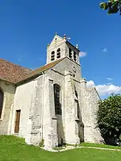C'est à la fin de la période romane que l'on peut situer le voûtement de l'ancienne base du clocher, et la construction de la deuxième et de la troisième travée du chœur, qui se termine par un chevet plat. L'église se résume alors à un seul vaisseau : au sud, l'on aperçoit toujours les traces d'une ancienne baie en plein cintre, dont la moitié a disparu lors de l'ouverture du mur vers la chapelle latérale sud, au milieu du XIIIe siècle. Le diamètre de son arc paraît important pour une fenêtre, mais le soubassement comporte une arcature plaquée en plein cintre, qui retombe sur deux colonnettes à chapiteaux. L'une des corbeilles est sculptée de feuilles d'eau, l'autre est abîmée. Il ne pouvait donc pas y avoir d'arcade vers une chapelle. Le tracé en plein cintre indique la période romane. L'emploi de l'arc brisé pour les trois voûtes d'ogives ne constitue toutefois pas une contradiction, car son apparition en Île-de-France est attestée vers 1125, dans l'actuel département de l'Oise (considéré comme faisant partie de l'Île-de-France dans l'histoire de l'architecture)[10]. Les chapiteaux et les petites clés de voûte, travaillés au trépan, sont d'une grande qualité, et reflètent bien le style du milieu du XIIe siècle. Il convient de préciser que toutes les fenêtres du chœur (concentrées dans la dernière travée) sont bien postérieures à la construction, et que l'entablement à la limite des allèges a été ajouté à la Renaissance, sans doute en même temps que fut créée la large baie du chevet.