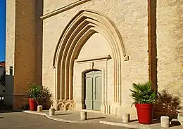 La façade occidentale présente un portail de style ogival en légère saillie, surmonté d'un grand oculus et d'un clocheton, et encadré de deux puissants contreforts. Le portail comporte une archivolte constituée de quatre voussures moulurées se prolongeant en de fines colonnettes reposant sur un décor d'arcatures trilobées. Cette archivolte est surmontée d'un larmier reposant sur des culs-de-lampe détruits. Ce portail intègre une élégante porte de style néo-classique édifiée à la fin du XVIIIe siècle ou au début du XIXe siècle : sur fond de bossages, cette porte présente un encadrement mouluré, un arc surbaissé et une clé d'arc saillante, le tout surmonté d'un entablement.
