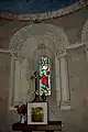- Le retable au mur nord de la nef est en pierre peinte en gris et date de la première moitié du XVIIIe siècle. Deux colonnes encadrent trois niches, celle du centre en plein cintre, les deux autres en arc brisé, surmontées d'un fronton. En relief dans le fronton une sculpture de Dieu le Père. Il manque un autel et un tabernacle (on peut discerner leurs traces sur le mur).