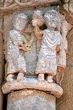 Il y a trois personnages sur la corbeille : celui de gauche est un jeune clerc, aux cheveux crépus, qui esquisse une génuflexion, ses bras sont réunis en avant, mais ses mains ont disparu. Il est probable que les mains étaient jointes en prière.