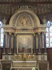 La pièce maîtresse du chœur est le maître-autel en marbre noir, bois polychrome et doré. Il est daté de 1712 et occupe presque tout l'espace compris entre les deux portes[19]. Au fronton figure le Christ en gloire[20]. Le coffre d'autel, en bois peint sculpté en ronde-bosse est orné d'un agneau pascal et de deux bas-reliefs[19]. Celui de gauche, inspiré par Léonard de Vinci[19], représente la Cène, et celui de droite le lavement des pieds[20]. Le tabernacle à cinq pans, en bois doré[20], est encadré par quatre colonnettes qui délimitent des niches contenant des statuettes[19]. Le retable est construit en retrait, sous une large corniche et un dais soutenus par six colonnes de marbre noir couronnées de chapiteaux corinthiens[19].