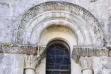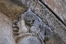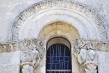 Six chapiteaux romans, dont deux sont historiés, soutiennent la corniche. Du sud au nord : feuillage d'acanthes, lions et dompteurs, acanthes, les quatre dogues, pignes, acanthes.