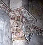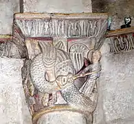 Le tailloir du chapiteau est orné d'une frise d'acanthe sèche. Sur la face principale de la corbeille, un ange nimbé est grimpé sur le dos d'un dragon ailé symbolisant le Diable. L'ange aux pieds nus enfonce un épieu dans la gueule du dragon.