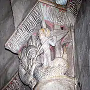 Sur la corbeille du chapiteau sud, deux serpents, enlacés par le cou de façon à former un nœud, se mordent la queue.