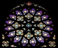 La rosace occidentale a pour centre une fleur de lys, symbole de pureté, entourée de huit pétales représentant les huit béatitudes, puis de seize décorés par un motif de séraphins. En haut, la main de Dieu (en) tendant une couronne. En bas, de chaque côté, les armoiries des papes Léon XIII et Pie IX. Celle orientale est sur le même modèle, mais les huit pétales sont décorés par huit symboles de Marie, séparés par des symboles des sept dons de l'Esprit saint. Avec, en haut, la main de Dieu bénissant.