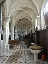 Ce qui fait l'intérêt archéologique de l'église, ce sont son plan à double nef, exceptionnel dans la région, et les voûtes avec leurs supports. Les doubleaux longitudinaux, ou autrement dit, les grandes arcades qui séparent les deux vaisseaux, présentent, sur l'intrados, un méplat délimité par deux listels ; et sur leurs faces latérales, une doucine et un méplat. Ce profil, peu usité, annonce la Renaissance par la perte de l'acuité propre aux profils flamboyants. Concernant les autres nervures, l'on constate un changement de modénature à partir du troisième doubleau perpendiculaire au nord, et du quatrième au nord. Les deux premiers doubleaux au nord, et les trois premiers au sud, sont en anse de panier, et prennent la forme d'arêtes fortement saillantes à trois rangs de claveaux. Les ogives affectent un profil prismatique aigu, encore proprement flamboyant, composé d'une arête saillante, agrémentée de plusieurs fines moulures concaves, entre deux baguettes. Le profil des formerets est directement dérivé de ce même modèle (par ailleurs, il n'y a plus de formeret dans la deuxième travée du sud). Plus à l'est, les doubleaux sont en arc brisé, et adoptent un profil plus simple, et moins encombrant. Il se réduit à une arête saillante très mince, dont les faces latérales sont légèrement galbées. Ce profil est partagé par les ogives et formerets. Dans ce contexte, il convient de signaler les clés de voûte. La plupart sont aujourd'hui frustes, et ont probablement été bûchées à la Révolution. Dans la quatrième et la cinquième travées du vaisseau principal, les ogives se croisent simplement à la clé, et il ne semble pas y avoir eu de décoration. Dans la sixième travée, la clé de voûte arbore une étoile à huit branches. Dans la cinquième travée du sud, l'on trouve encore un écusson entouré d'un collier, réduit à l'état de fragment. Dans la dernière travée, soit la chapelle de la Vierge, l'écusson arbore le monogramme MA, et est entouré d'une guirlande. Au nord, les voûtes retombent sur des chapiteaux doriques ébauchés, sans tailloirs, portés par des piliers cylindriques engagés dans le mur. Au niveau des grandes arcades, les piliers se terminent par une frise de glyphes, qui ne sont ici pas regroupés en triglyphes ou biglyphes et n'alternent pas avec des rosaces ou patères à ombilic. Ce n'est qu'au chevet qu'apparaît une tête sculptée. Les tailloirs sont formés par des chapiteaux ioniques, avec un rang d'oves et un rang de perles. Au sud, l'on trouve des piliers engagés de trois types différents. Les trois premiers sont doriques, avec une frise de glyphes ; le cinquième est corinthien ; et le quatrième est ionique, mais plus abouti, tant sur le plan de la modénature que de la sculpture : des triglyphes à gouttes alternent ici avec des têtes de chérubin au-dessus d'un collier d'ailes, et un bucrane[4].