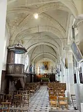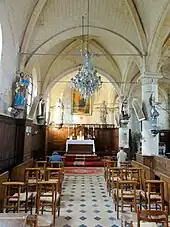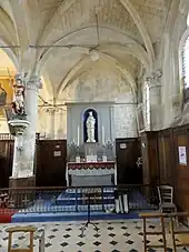 Les murs latéraux et le chevet sont habillés de boiseries jusqu'à la limite des allèges. Elles sont d'une facture très simple, et constituées de simples panneaux de fenestrages, avec une cimaise moulurée. Un étroit couloir passe derrière les boiseries du chevet, éclairé par une petite fenêtre basse derrière l'autel de la Vierge. Les portes d'accès à ce couloir, de part et d'autre du retable du maître-autel, arborent en haut une croix. Ici seulement, les boiseries sont couronnées par une petite balustrade constituée d'arcatures en plein cintre découpées à jour. Elle incorpore deux consoles, qui servent de supports à des statues. Le maître-autel, de la même facture que les boiseries, et les gradins d'autel et le tabernacle, dont la porte est seulement décorée d'une petite niche en plein cintre et d'un fronton triangulaire, sont homogènes avec le revêtement des parois. L'autel de Notre-Dame de Bon-Secours et son retable ne sont pas contemporains des boiseries, et encore plus sobres. Le confessionnal a sans doute été confectionné par le même huchier que les boiseries.