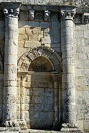 Le rez-de-chaussée est occupé par un portail en plein-cintre à trois voussures peu ornées encadrant un tympan grossièrement maçonné. De chaque côté, deux petites baies aveugles en tiers-point sont flanquées chacune de deux fortes colonnes à chapiteaux, tandis que leurs bases reposent sur une banquette. Ces colonnes supportent une corniche à modillons. L'espace entre les modillons est finement décoré avec des métopes aux motifs de feuillages, figures géométriques et d'entrelacs.