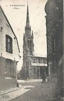 Au milieu du XIXe siècle, l'ancien maire de la ville Obert Martel, Vicomte de Quiévy, veut rénover le centre ville de Wambrechies. Il décide de créer un espace dans le centre de la ville avec une église et un hôtel de ville. L'architecture de l'église est confiée à Charles Leroy (architecte de Notre Dame de la Treille à Lille), qui décide de faire une tour, surmontée d'une flèche qui culmine à 72 mètres.