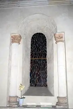 - Les seuls vestiges de l'église romane à l'intérieur sont les chapiteaux et les socles des colonnes qui encadrent les cinq baies de l'abside. La décoration des chapiteaux est très simple : entrelacs et feuillage.