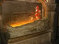 Enfin, dans la nef centrale, haute de douze mètres et datant du XIIe siècle, on peut observer sur un pilier une pierre tombale dressée. Elle figure un personnage dans une position de prière, à genoux et les mains jointes. Le style est médiéval et une date y figure : , mort du défunt représenté. Le texte en latin de l'Ave Maria fait le tour de la pierre.