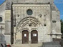 Un bandeau en forme de larmier surmonte la triple archivolte. Il est animé de quelques animaux fantastiques et feuilles frisées. Ces sculptures sont très dégradées et incomplètes, mais semblent d'une plus grande finesse que les sculptures déjà signalées, qui sont d'une facture assez grossière malgré leur grande plasticité. On serait tenté de les considérer comme néogothiques, d'autant plus que le trumeau et le piédroit droit ont entièrement perdu leur sculpture du fait de l'emploi d'une pierre trop tendre qui ne résiste pas aux injures du temps. L'on voit une nette rupture en bas de la niche à statue centrale et en bas de la triple archivolte, à droite. Dans le même sens va l'examen des dais flamboyants des niches à statues qui cantonnent le portail, à gauche et à droite. Ils sont d'une grande qualité. La niche de gauche a été refaite, ainsi que sa console, qui repose sur un pilastre. À droite, plus aucun détail sculpté n'a résisté aux dégradations en dessous du dais. Restent à évoquer les arcatures plaquées qui occupent les surfaces murales au-dessus du portail, jusqu'à la naissance du pignon. Elles sont formées par des accolades, et ne présentent pas les têtes trilobées qui font l'essence même du style flamboyant. Un larmier protège ces arcatures. Il relie les glacis sommitaux des deux contreforts occidentaux de la nef, qui sont scandés par deux niveaux de larmiers présentes sur les trois faces. Dans les angles entre les contreforts et le larmier, se profilent des sculptures devenues méconnaissables. Au milieu des arcatures, un oculus entouré d'une doucine ajoure la façade au-dessus du portail. Le reste de la façade, c'est-à-dire le pignon de la nef et le mur occidental du bas-côté avec son demi-pignon, n'est guère décoré. Le pignon est percé de deux petits oculi circulaires pour l'aération des combles, et sommé d'une croix nimbée en antéfixe. Des pierres d'attente en bas du rampant de gauche, et à gauche du contrefort de gauche, qui font saillie devant le mur du bas-côté, témoignent du projet d'édifier un clocher, resté sans suite. Contrairement à la façade de la nef, le mur du bas-côté est appareillé en moellons et enduit. Un œil de bœuf représente l'unique jour du bas-côté. Malgré le caractère provisoire du mur du bas-côté, il est entouré de pierres de taille, et un larmier marque la limite de l'allège.