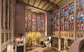 Les murs latéraux sont percés à mi-hauteur d'immenses baies laissant une large place aux vitraux de Max Ingrand, qui aspirent la lumière au-delà des toits. Ces vitraux s'harmonisent parfaitement avec les fresques de Paule Ingrand, les statues de Gabriel Rispal, les fers forgés de Richard Desvallières et les torchères de Jean Serrière[2].