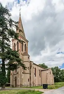 L'église actuelle est relativement austère, entourée de son petit cimetière. En forme de croix latine, avec des chapelles latérales, elle est en brique et présente des contreforts.