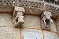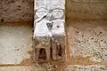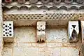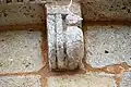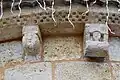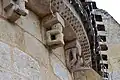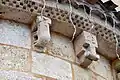 La façade occidentale à arcatures est percée d'une porte formée de trois arcades en plein-cintre à voussures unies et en retrait. La grande arcade chargée de dents de scie et de pointes de diamants est ornée de rouleaux. Au-dessus, trois arcs en plein-cintre retombent chacun sur une paire de colonnettes. Une seconde corniche sépare cet étage du pignon triangulaire.