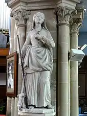 - La statue en pierre de sainte Geneviève, patronne de la paroisse, de 1861[26], à droite de l'entrée du chœur.