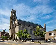 L'église, construite avec 1 800 tonnes de pierre provenant des carrières de calcaire de Bedford, mesure 57 mètres de longueur, 21,3 mètres de largeur et 29 mètres de hauteur jusqu'au gable[1]. La tour s'élève à 37 mètres. Des détails gothiques élaborés marquent l'autel, mais les médaillons contenant plus de 200 000 pièces de vitraux, conçus par Schlacks, sont le véritable point culminant de l'intérieur.