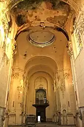 Le sanctuaire se compose d’un vaisseau unique étroit mais élevé, ce qui confère un élan vertical à l’espace intérieur. L’édifice repose sur deux niveaux séparés par une hauteur de marche de quinze centimètres entre le transept et le chœur. L’intérieur est entièrement enduit d’un badigeon blanc cassé. L’ensemble des parois propose la répétition d’un même module : des pilastres colossaux se dressent jusqu’à la naissance des arcs-doubleaux en plein cintre et les fenêtres placées très haut occupent la paroi du centre de la travée. Les pilastres reposent sur une haute base composite de moulures creuses et pleines. Le fût comprend un panneau rectangulaire en creux menant au chapiteau de type corinthien rehaussé de volutes aux angles. Les voûtes couvrant l’édifice sont en briques maçonnées toutes boutisses en circonférence entre les doubleaux. Elles sont renforcées par des arcs formerets en croix maçonnés posés en panneresse et boutisse, d’une brique et demie d’épaisseur.