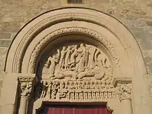 Le tympan représente la scène de l'Épiphanie. La marche des Rois Mages est orchestrée par des anges qui sonnent de l'olifant : les quatre figures ailées pourraient représenter les anges qui retiennent les 4 vents aux 4 coins du monde.