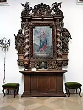 L’autel, en bois brun, comporte quatre niveaux à décor richement doré. Entre deux anges, le tabernacle se présente comme un édicule avec baldaquin et couronne dorée. Par-dessus, un grand retable illustre l’Assomption de Marie, avec son accueil aux cieux et son couronnement par la sainte Trinité. Il est signé «J. G. Bergmiller Aug. Vind, 1718». Ce tableau est précédé, dans la partie inférieure, par un portrait du Christ en Salvator Mundi. De part et d’autre du grand retable, des atlantes portent des colonnes garnies de feuilles de lierre dorées.