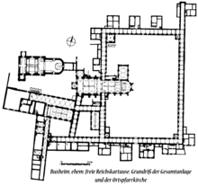 La première église a sans doute été construite lors de la fondation de cet ensemble religieux vers l’an 1100. L’actuel chœur des moines date sans doute du XIIIe siècle, on suppose qu’à l’origine il constituait l’église collégiale de la première congrégation. Il s’agissait alors d’une construction en briques, non crépies, avec des fenêtres à remplages en tiers-point et des voûtes gothiques. Les chartreux ayant reçu le couvent en 1402, une donation leur permit en 1435 de se procurer un grand retable. La plus importante transformation architecturale consista en la construction d’un chœur des frères, avec jubé, élevé vers 1450 par le frère-lai Collmanus pour la séparation des moines et des frères-lais. Au nord du chœur des moines, on construisit une sacristie sur deux niveaux, dont l’étage fut destiné à la conservation des archives du couvent[* 1].