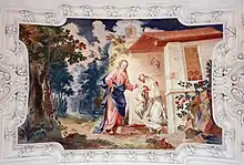 Les trois travées sous la galerie sont ornées chacune d’une fresque. Ces scènes mariales sont du même genre que celles qui ornent les voûtes du jubé. La peinture du centre est accompagnée de quatre emblèmes mariaux également peints à la fresque[* 8].