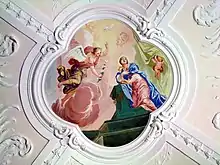 La première fresque en quadrilobe, à l’est du chœur, montre la glorification du cœur de Jésus. Le centre du tableau est occupé par un cœur entouré de flammes. Une couronne d’épines entoure le cœur en souvenir de la Passion du Christ, sur le flanc gauche, on observe la plaie béante. D’une ouverture en forme d’entonnoir jaillit une grande flamme qui éclaire le trigramme du Christ IHS muni d’une croix. Sous le cœur est assis, sur un nuage, un ange en sandales, vêtu de jaune avec une écharpe bleue. Il balance un encensoir en direction du cœur, signe de respect et de prière. De part et d’autre voltigent des groupes de putti portant les instruments de la Passion. À droite un ange, aidé de putti, porte la croix et les clous. À gauche, plusieurs putti portent la colonne de la flagellation, les verges et les fouets, ainsi que l’éponge de vinaigre et la lance. Les putti au premier plan tournent le dos au spectateur. Leurs pieds, en stuc peint, font saillie sur le cadre. Sur le bord inférieur de la fresque, une balustrade blanche est animée de putti et de fleurs.
