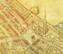 Église Sainte-Marie sur un plan de 1647 avec l'ancienne tour
