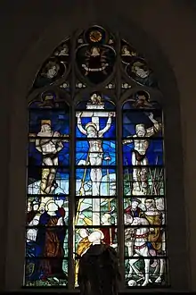 Le vitrail central du chœur représente la crucifixion du Christ. Sur les lancettes latérales on voit les deux larrons. La lancette du milieu montre la lance du soldat Longin qui transperce le flanc du Christ (à gauche) et le soldat Stephaton qui lui tend une éponge imbibée de vinaigre (à droite). Sur la lancette gauche est représentée Marie, la mère de Jésus, sur la lancette droite, on voit deux chevaliers et au pied de la croix Marie Madeleine. Au tympan sont représentés des anges et des têtes d'anges, la Vierge au milieu est plus récente.