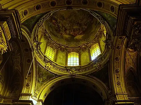 La coupole est peinte de fresques de Francesco de Mura; on remarque dans une chapelle de gauche La Crucifixion de Giacinto Diano.