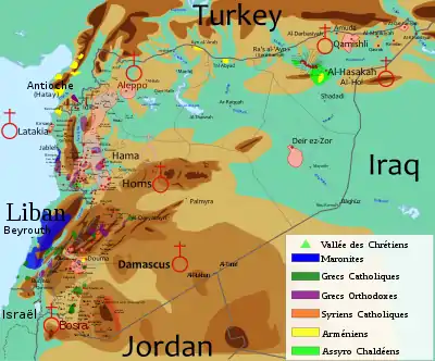 Dans une population de 18 millions d'habitants où 87 % appartiennent à l'Islam[18], et 5,2 % au christianisme (10%[19] avant la guerre), dont 2,9 % d'Orthodoxes (1,9 million), dont les grecs-orthodoxes (1,1 million), les syriaques orthodoxes (700 000), et les orthodoxes arméniens (100 000), puis l'Église catholique qui est une communauté religieuse minoritaire avec environ 368 000 catholiques (2 %) : 200 000 melkites, 9 000 latins, 14 000 chaldéens, 18 000 syriaques, 26 000 arméniens et 52 000 maronites.