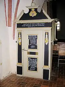 La chaire du côté droit remonte à 1703 et l'autel à deux niveaux soutenu par des colonnes et décoré de personnages bibliques à 1729.