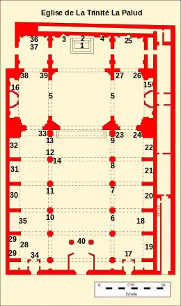 Légende du plan : 1- Maître autel dessiné par Henri Révoil ; 2- La très sainte Trinité, tableau de Jean-Baptiste Arnaud-Durbec ; 3- Statue du Sacré-Cœur ; 4- Statue de saint Pierre ; 5- Stalles ; 6- Statue de saint Louis ; 7- Statue de saint Christophe ; 8- Statue de saint François de Sales ; 9- Statue du curé d'Ars ; 10- Notre-Dame des Douleurs ; 11- Statue de saint Jean Bosco ; 12- Statue de sainte Bernadette Soubirous ; 13- Statue de saint Roch ; 14- Chaire ; 15- Confessionnal néo-baroque 16- Confessionnal de l'abbé Fouque ; 17- Porte latérale ; 18- Au-dessus de l'accueil, tableau de Jean-Joseph Dassy représentant la mise au tombeau ; 19- Chapelle des âmes du purgatoire 20- Chapelle de l'ordre de la Très Sainte Trinité pour la libération des captifs avec tableau de Théophile Henri Mayan dit Théo Mayan représentant la sainte Vierge, saint Félix de Valois et saint Jean de Matha; 21- Chapelle de saint Antoine de Padoue ; 22- Chapelle du Sacré-Cœur de Jésus ; 23- Statue de sainte Marie-Madeleine ; 24 - Statue de saint Clair ; 25- autel de la Vierge ; 26- Statue de sainte Rita de Cascia ; 27- Statue de Sainte Thérèse de l'Enfant Jésus ; 28- Fonts baptismaux ; 29- Fresques du baptistère en provenance de l'atelier de Dominique Antoine Magaud ; 30- Chapelle de sainte Anne et de Sainte Rose de Lima ; 31- Chapelle de Notre-Dame de Lourdes ; 32- Chapelle de saint Joseph ; 33- Icône de Notre-Dame du Perpétuel Secours ; 34- Porte latérale ; 35- Tableau de Michel Serre représentation indéterminée ; 36- Autel de saint Sérénus ; 37- Pavement paléochrétien en provenance du baptistère de la Vieille Major (Ve siècle) ; 38- Statue de Jeanne d'Arc ; 39- Statue de saint Jude ; 40- Orgues de tribune, construites par Prosper-Antoine Moitessier.