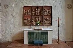 Le retable du XVe siècle a été restauré en 1960 à partir de parties du retable médiéval. Les thèmes sont: l'apparition de Marie, le Christ Roi, l'adoration des mages, l'enfant Jésus dans le temple, le chagrin de Marie et de Jean, et la naissance de Jésus dans l'étable. À gauche de l'autel se trouve aussi une peinture de la crucifixion, réalisée par Margareta Capsia en 1747. Le tableau a servi de retable dans les siècles précédents.