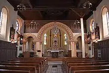 Vers la nef des boiseries couvrent les murs et les bancs à mi-hauteur. Trois autels meublent l’abside et les deux petites chapelles absidiales. L’autel principal ressemble à une forteresse, il est encadré par deux jolis vitraux représentant le Sacré-Cœur et la Vierge Marie de 1857.