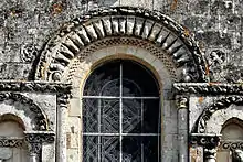 L'arcature du premier étage et sa corniche à modillons restent les seuls éléments de la décoration romane qui ont été conservés.