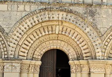 La façade est percée d'un portail unique, qui a conservé une archivolte romane, ornée de petites feuilles frappées de fleurons, un motif souvent utilisé en Saintonge.