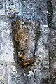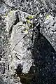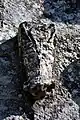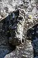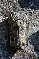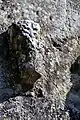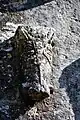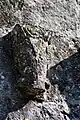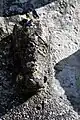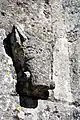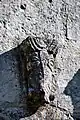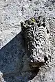 - Un homme nu en traîne de manger une hostie (l'eucharistie sacrilège). Habituellement dans cette représentation l'homme est aussi ithyphallique, ici, le modillon a été martelé entre ses jambes.