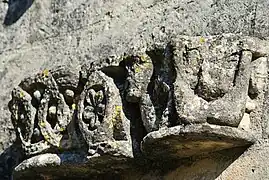 Au-dessus ces chapiteaux une alignement de vingt-trois têtes de chevaux d'un contrefort à l'autre. Quelques autres de ces têtes se voient sur les contreforts et en retour sur le mur sud. Ils sont les vestiges d'une façade, ou plus probablement, d'une archivolte plus ancienne et remployés en ornementation supplémentaire, car ces sculptures ne sont pas des modillons, mais des claveaux.