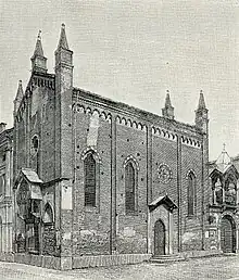 Les murs de l'église étaient en briques pleines, laissés apparentes à l'extérieur. La structure architecturale apparaît relativement simple de l'extérieur, avec une façade gothique divisée en trois bandes verticales. Un portail en ogive y donne accès. Au-dessus du porche se trouve une petite fenêtre en oculus[2]. A droite du portail se trouve l'urne funéraire du célèbre docteur Bavarino Crescenzi, mort en 1346, représenté sur une plaque de marbre rouge[3] : l'oeuvre est généralement attribuée au tailleur de pierre Rigino di Enrico[4].