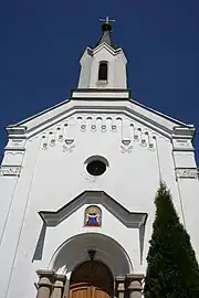 À l'extérieur, les façades sont richement décorées. À l'ouest, le portail principal est encadré de colonnes et de piliers et surmonté par un fronton ; les façades sud et nord possèdent la même structure que la façade occidentale. Cette façade est dominée par un haut clocher hexagonal de style néo-gothique. Cette rupture stylistique dans une église datant de la seconde moitié du XIXe siècle s'explique par le fait que les constructeurs de l'église venaient de Dalmatie[4]. Au-dessus du portail principal se trouve une petite rosace dépourvue de décoration ; deux autres rosettes ornent les façades latérales du narthex[4]. Dans un la partie supérieure de toutes les façades court une série d'arcatures aveugles surmontées par une corniche ; les façades latérales sont dotées chacune de deux grandes fenêtres, tandis que l'abside possède une ouverture centrale et deux autres plus petites pour les niches de la proscomidie et du diakonikon[4]. Toutes les façades sont rythmées par des pilastres peu profonds dont le sommet est décoré de feuilles stylisées[4].