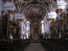 L'intérieur rococo date du milieu du XVIIIe siècle. Les fresques des plafonds sont l'œuvre de Christoph Thomas Scheffler et de son frère Felix Anton, le maître-autel de Johann Baptist Baader (1758), montrant la Crucifixion du Christ.