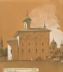 L'église du monastère du Sauveur-Sainte-Euphrosyne est un édifice du XIIe siècle et donc de l'époque pré-mongole de la Rus' entièrement conservé, auquel ont été ajoutés des éléments nouveaux au XVIIe siècle et XIXe siècle au niveau de la toiture. La valeur de l'architecture a été reconnue, malgré son délabrement, dans les années 1830 et l'église a été conservée à ce titre comme « précieux monument russe souvenir de l'architecture ancienne »[6]. Seul l'examen des reproductions de l'état initial de l'édifice lors de sa construction au XIIe siècle permet de constater les transformations importantes du toit qui sont intervenues là où existaient à l'origine des zakomars et des kokochniks[7]. C'est le cas de nombreux édifice pré-mongols.