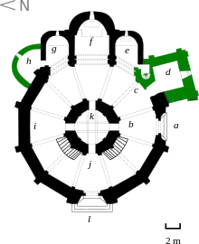 Le temple est réalisé en style roman, déjà en transition avec le gothique, avec une nef dodécagonale, qui entoure un édicule à deux hauteurs, auquel se sont ajoutées trois absides, une sacristie semi-circulaire et une tour carrée.