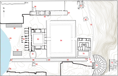 C’est semble-t-il à la même époque la partie orientale de la stoa romaine est à son tour convertie en édifice chrétien, puisqu’elle suppose la destruction préalable du chalcidicum dont les piliers sont remployés dans l’église (voir supra). Un ensemble de salles de réception et de chambres privées est aménagé dans le portique, autour d’une cour à péristyle. On y trouve aussi des latrines et des installations thermales. Le voisinage immédiat de l’église de Marie et le plan général suggèrent qu’il s’agissait de l’épiskopéion, la résidence épiscopale qui, dans l’Antiquité tardive, flanque généralement l’église cathédrale[13]. Bien que l’aménagement de cette résidence soit ainsi daté vers 500, les sources littéraires attestent l’existence d’un palais épiscopal dès le début du Ve siècle à Éphèse : l’évêque Antoninus est en effet déposé en 400 notamment pour avoir pillé les matériaux de construction de l’église voisine pour décorer sa résidence. Il aurait transféré des colonnes dans sa salle de banquet et du marbre du baptistère pour décorer ses bains[14].